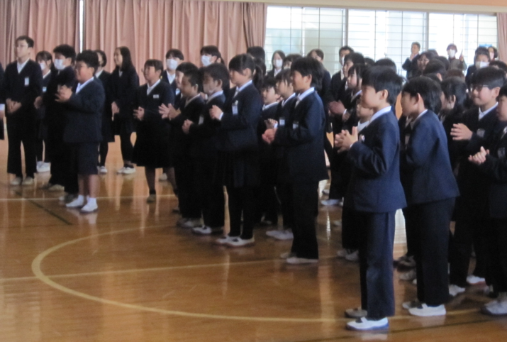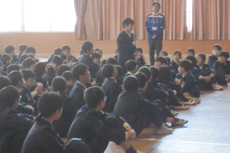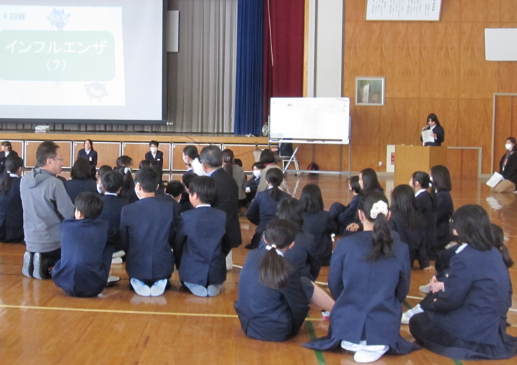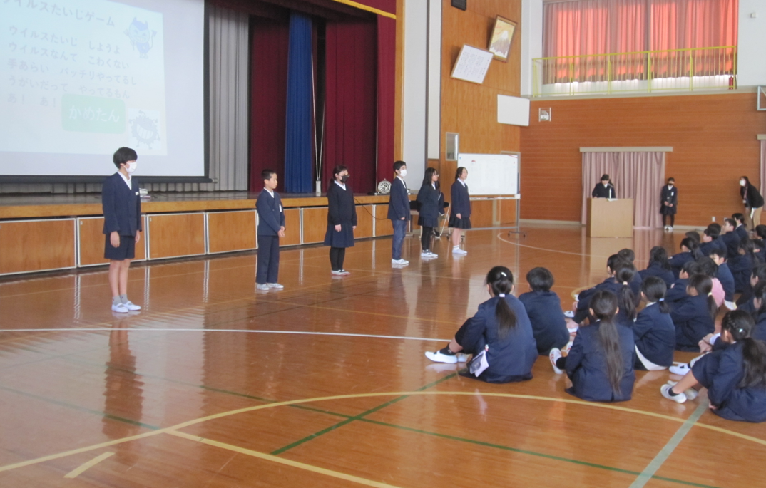 2026年1月21日 19時44分保健委員会が、冬に猛威をふるう菌のことを知るための集会を開きました。委員会のメンバーが「猛獣狩り」のリズムにのって、かぜ予防につながる言葉を伝えながら、健康に過ごすための知識を入れたクイズを提供。これから健康に過ごすための情報を楽しく学習した三瓶っ子です。