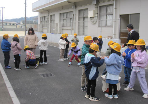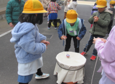 2026年1月13日 19時11分生活科の時間に、こま回しの対決をしていた1年生。日に日に腕をあげて、こまをステージで回すことができるようになってきました。こまにひもを巻くこつを教えている三瓶っ子も!