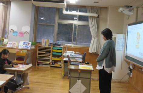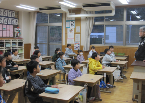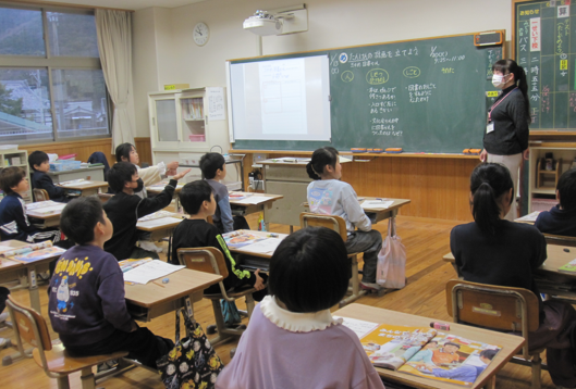 同じく生活科。先生から仕事の話を聞いていた2年生。いろいろな仕事に興味を持ってもらいたい時間です。先生の先生を目指すことになった話に、興味津々の三瓶っ子。