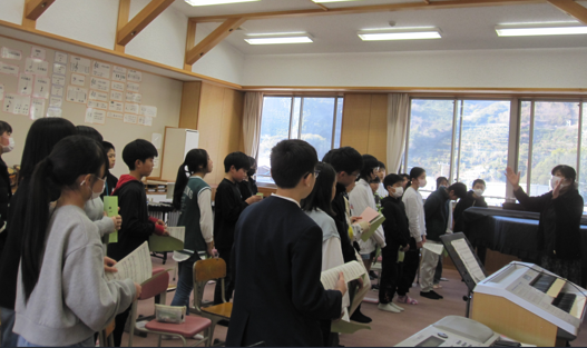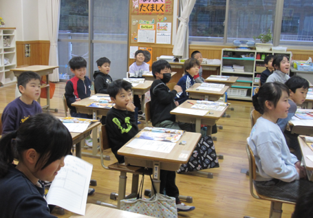音楽で歌っていた6年生。高い声、低い声、全体の声が一つになるよう、丁寧に、楽譜を見ながら進めます。同じ個所をリズムよく、何度も歌っていた三瓶っ子。