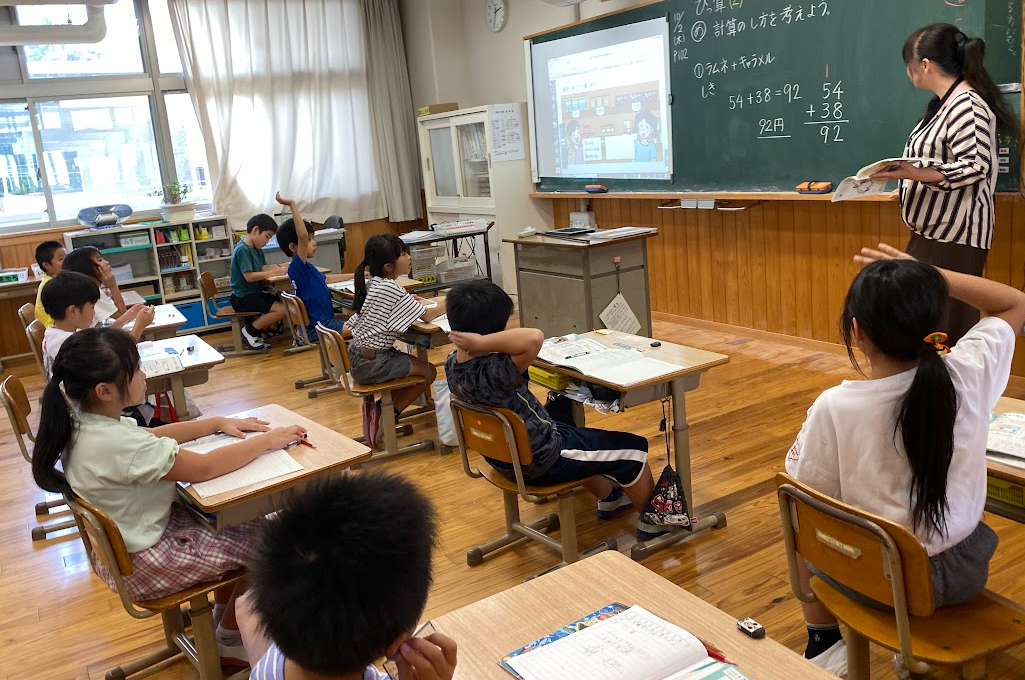算数で筆算を学習中の2年生。これまでの筆算のやり方を確認しながら、次の学習へ!今度はどんな計算か興味をもって学ぶ三瓶っ子。