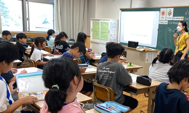 外国語を学習していた5年生、学んだことを振り返りながら、先生との会話を楽しむ三瓶っ子。
