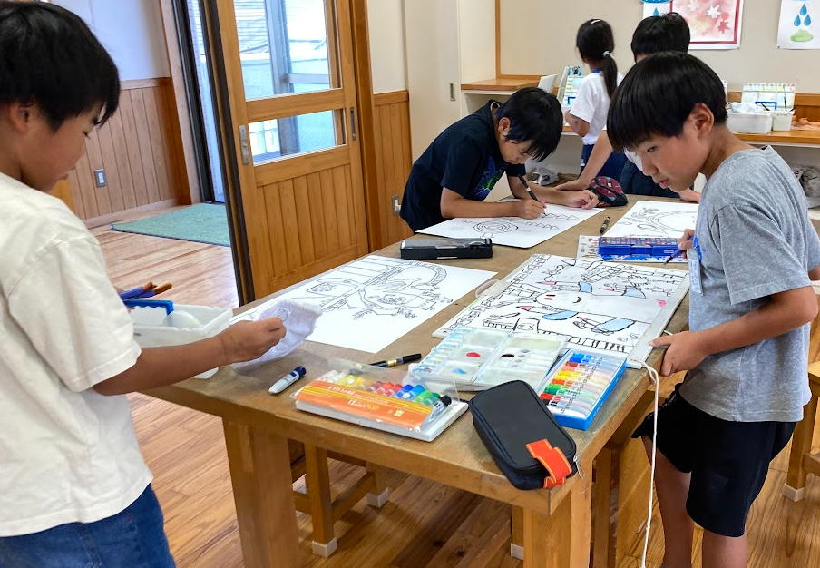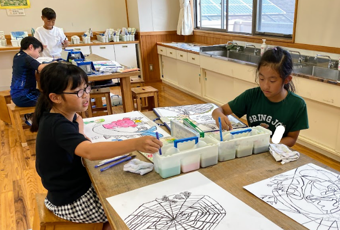 図工で作品作りを楽しんでいた4年生。自分の世界を描き、丁寧に色を塗る三瓶っ子。