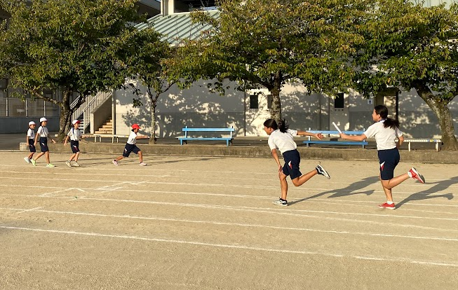 陸上選手の練習風景。話を聞く姿勢にやる気を感じる三瓶っ子。