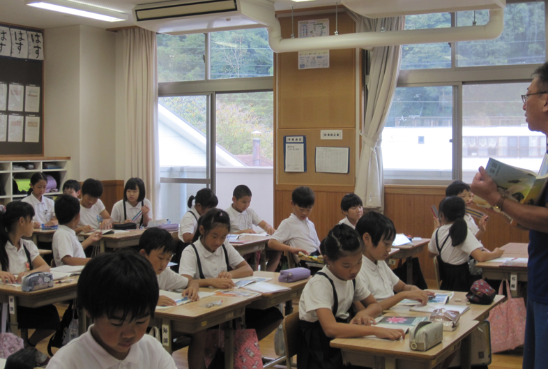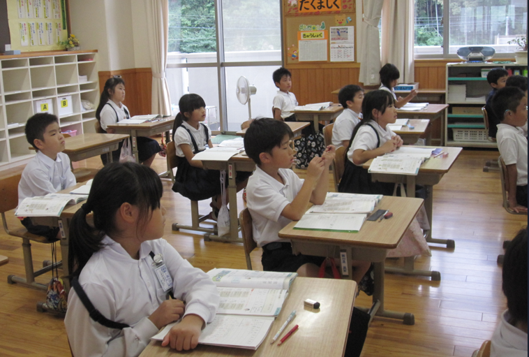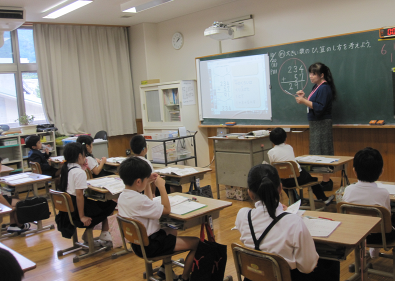 算数で筆算の学習をしている2年生。復習をしながら、新しいことを学びます。しっかり話を聞いている三瓶っ子。