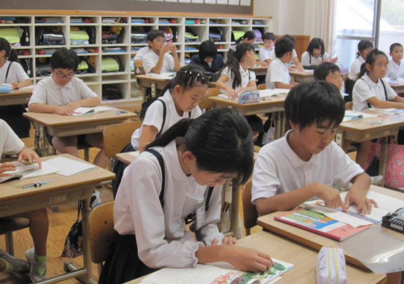 2025年10月22日 15時02分国語の教科書で、リーディングの道具を使っていた4年生。文章を読むときの道具で、色がついているラインが入っています。様々なラインの色や、色の組み合わせがありました。道具があると読みやすさを感じる人のために開発されたとのこと。