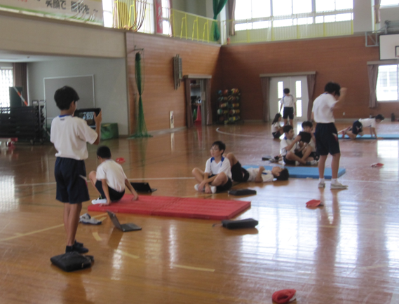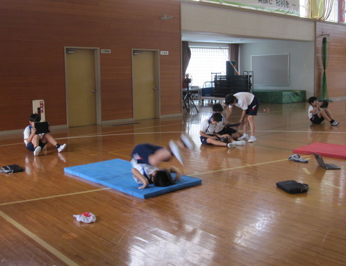 体育でマット運動をしていた6年生。自分の姿を動画撮影し、動きの確認をします。