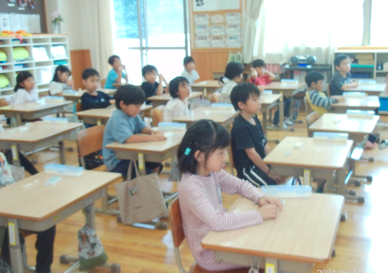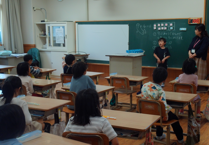 2025年10月23日 15時33分算数の学習をしていた1年生。繰り上がりのあるたし算の考え方をブロックを操作しながら唱えます。友達の発表を聞いて反応をする三瓶っ子。