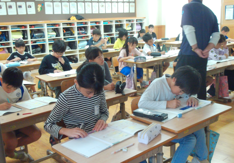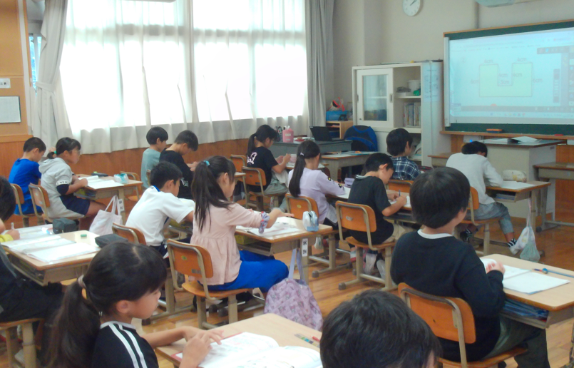 算数で面積を求める学習をしていた4年生。長方形や正方形でない形の面積に挑戦中。工夫して求めようと考えている三瓶っ子。
