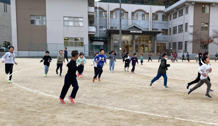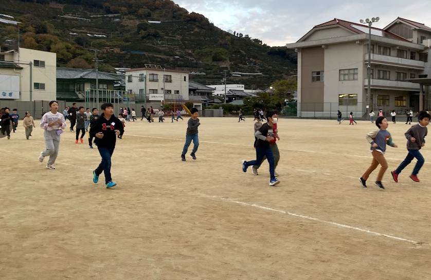 2025年12月12日 08時22分元気に運動場を周回する三瓶っ子。時間が来ると放送とともにスタートします。毎日何周走ったのか、記録をしています。ポイントの数まで行くと、〇〇先生の所へ!何があるかなお楽しみ。