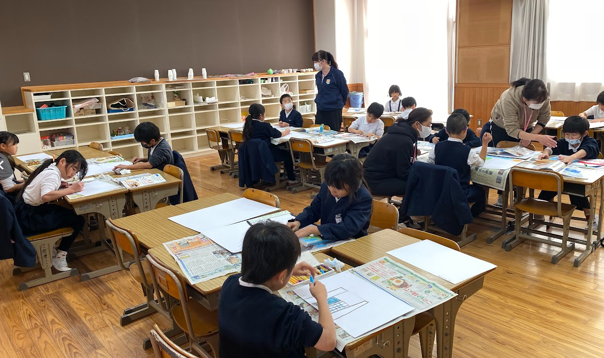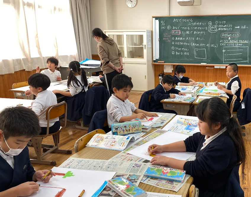 昨日のこと、2年生が絵を描いていました。自分がどこにいるのか想像しながら描く絵です。工作の仕掛けになるようです。楽しく、想像が膨らむように、先生のお話が入ります。どんどん描き進める三瓶っ子。