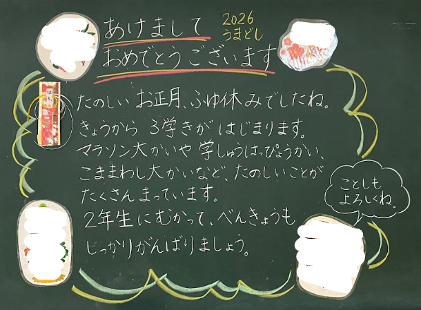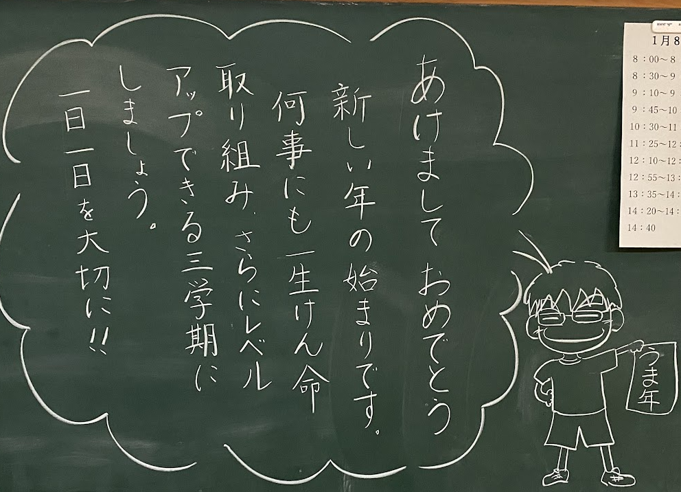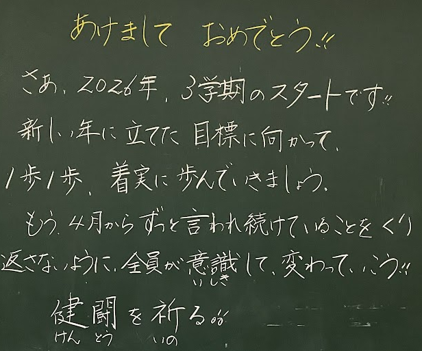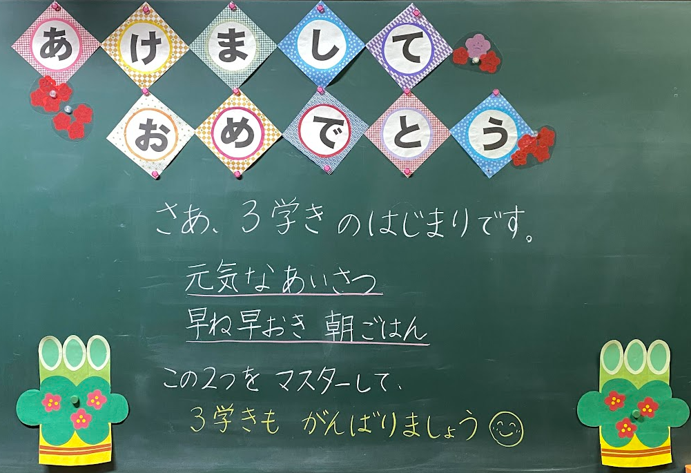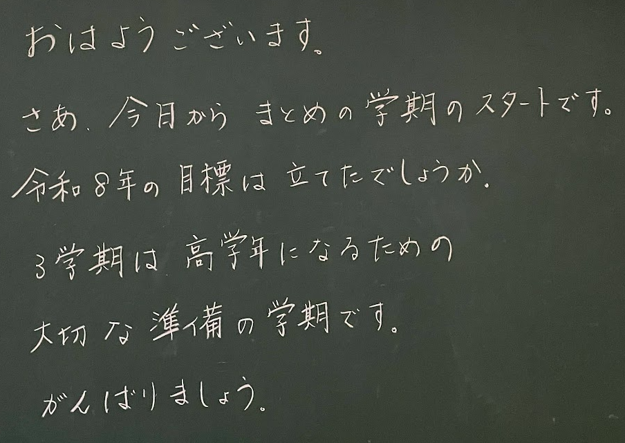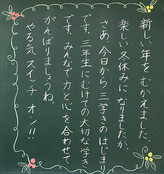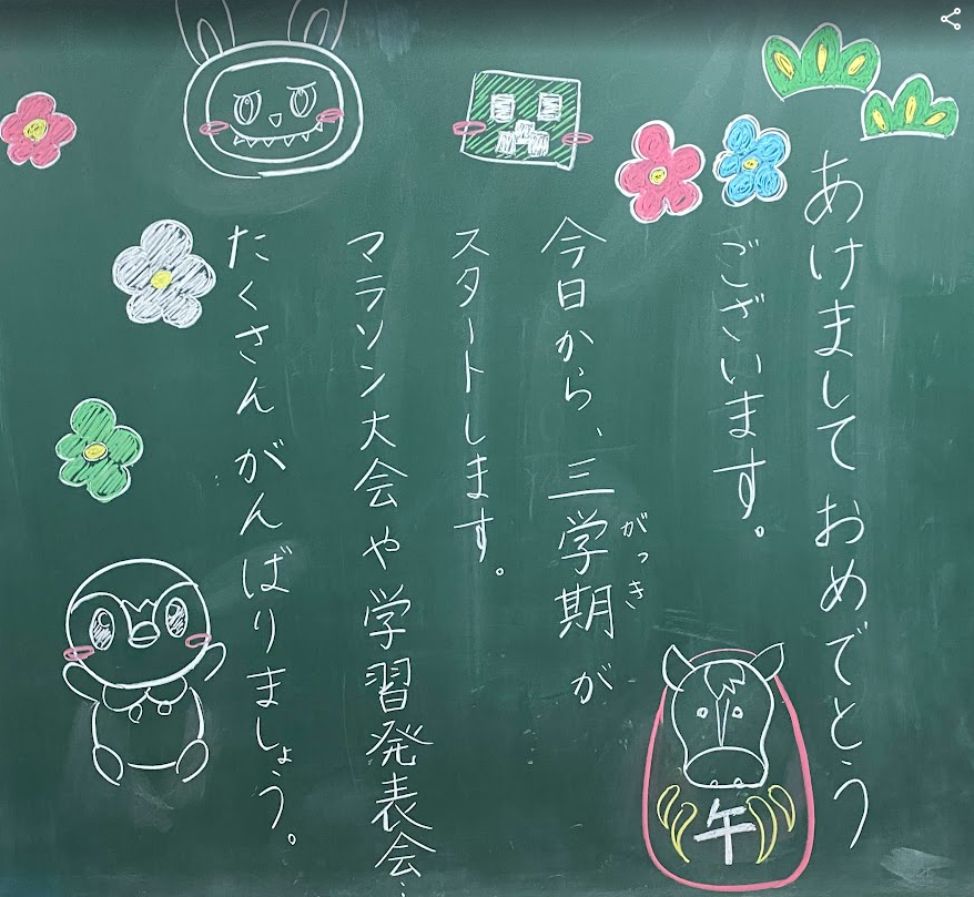 早朝の各教室には、担任の先生からのメッセージがありました。先生方も三瓶っ子との3学期を楽しみにしています。
