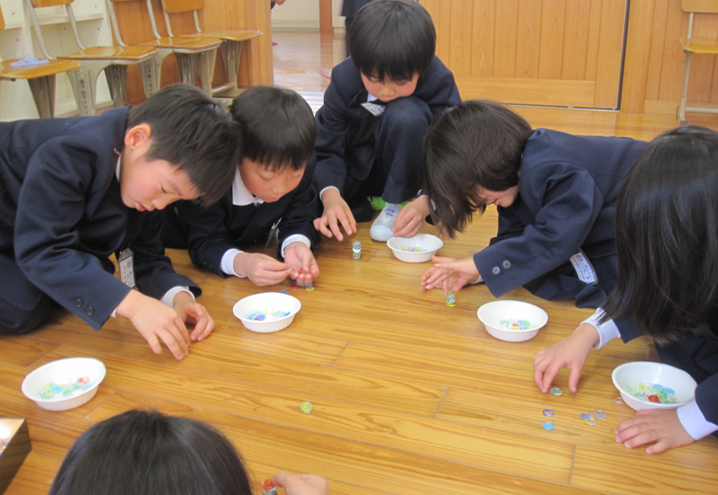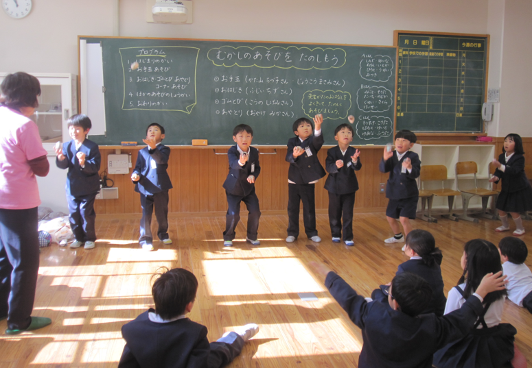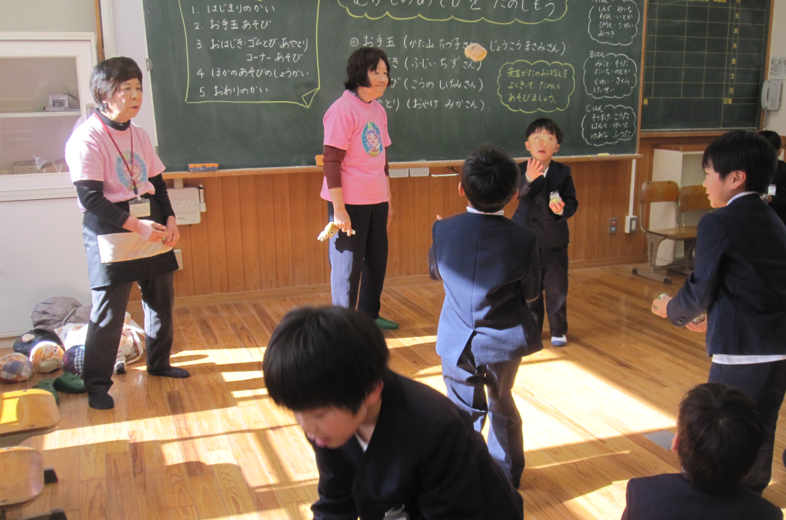 生活科の学習で、昔の遊びに親しんだのは1年生。市内、町内より、遊びの先生に来ていただき、楽しいひとときを過ごしました。お手玉、あやとり、おはじき、ゴムとびなどで盛り上がりました。最近、こま回しがブームの1年生でしたが、新たなブームがやってくる気配です。