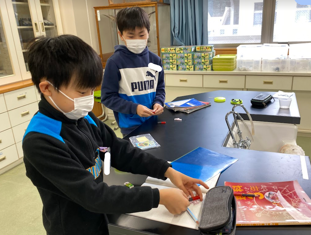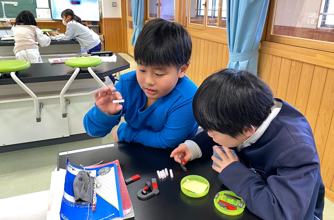 磁力について実験中の3年生。磁石にはどんな力があるのかな?磁石に「引き付けられるもの」という言葉の学習をした三瓶っ子。磁石にくっついたときは、「引き付けられる」という言葉を使うことを学んでいた三瓶っ子。
