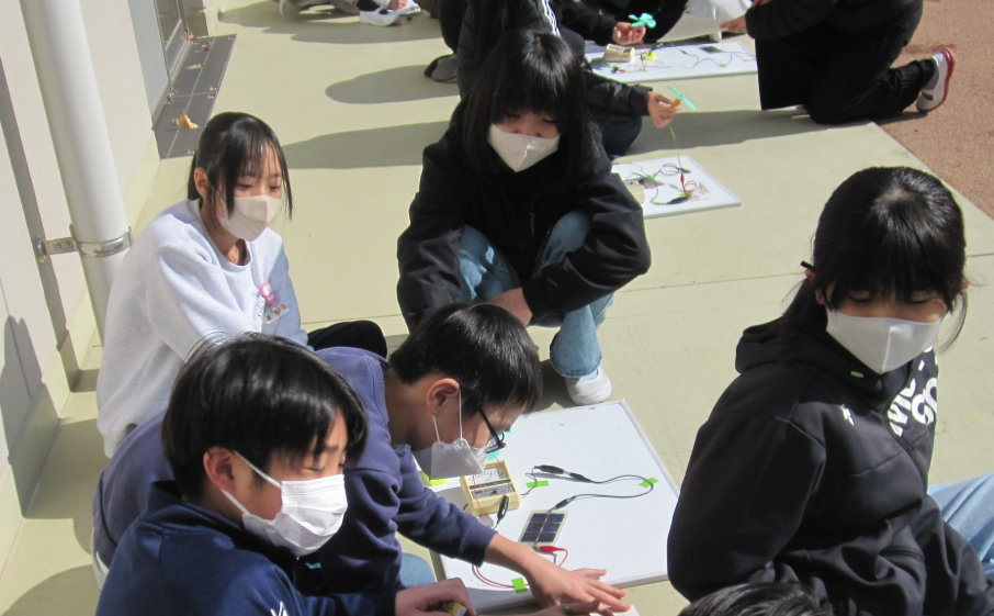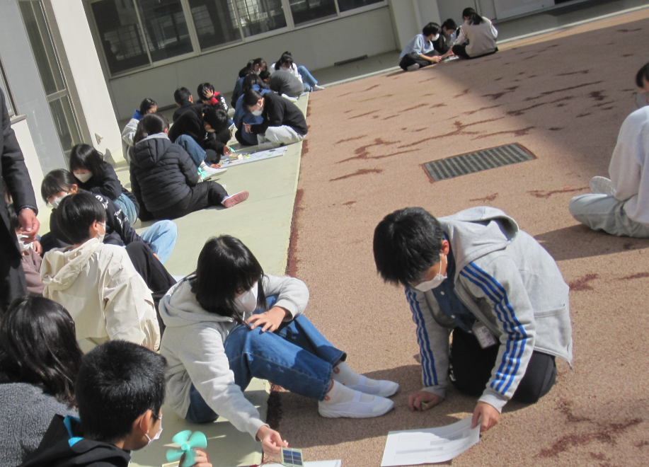 ワークコートの日だまりに、集まっていた6年生。理科の実験中でした。エネルギーの学習中。この日は太陽の力に注目です。