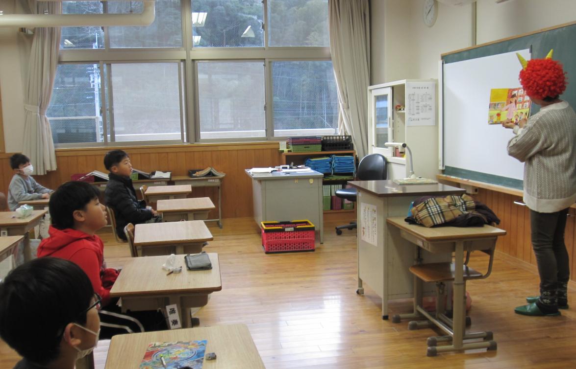 2026年2月5日 01時19分火曜日の朝は、読み聞かせの日。この日も3人の方が来校されました。おや、この日は節分ということもあり、あの方も!