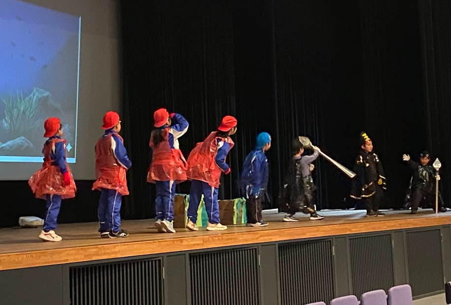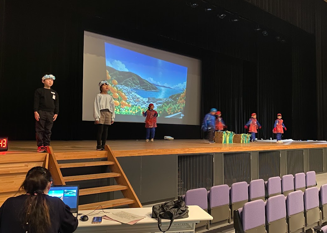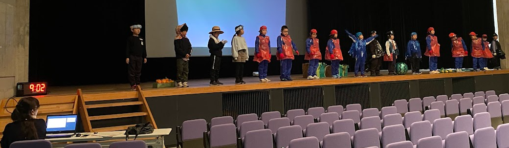 学習発表会に向けて、文化会館での練習をしている三瓶っ子。この日の1時間目は2年生。先生がパソコンの準備をする間、それぞれが舞台に立って、声出しです。だれからともなく、自分のセリフを堂々と表現。ステージの使用時間を有効に使って、この発表会を成功させたいという強い思いを感じました。その後、始まった本番を想定した練習では、役者さん顔負けの演技派三瓶っ子が続々と登場し、あっという間の20分間。見ていただいた校長先生から、後ひと頑張りのポイントをお話いただきました。本番が楽しみです。