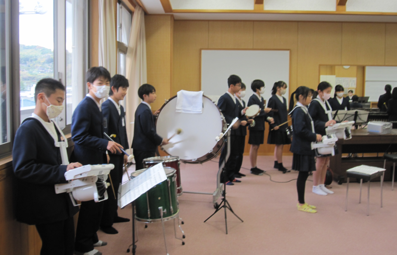 音楽の時間に少しずつ合奏の練習をしている6年生。楽譜が自分のものとなり、リズムにのって演奏している三瓶っ子。