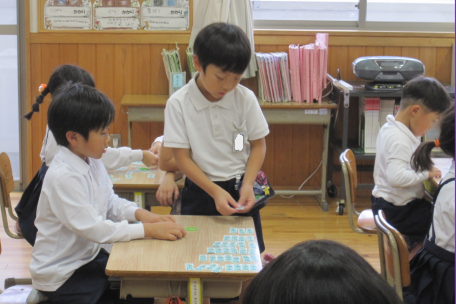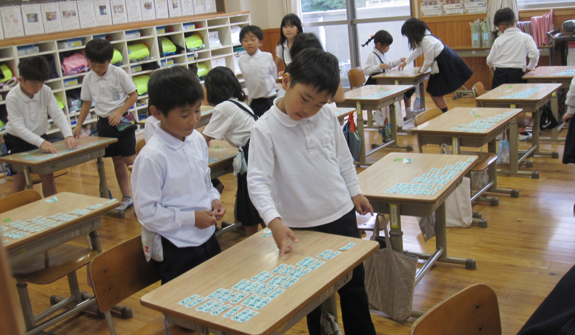 たし算カードを並べていた1年生。たされる数が同じカードで仲間分け。そして、たす数がどんどん増えるように並べています。並べ終わると階段みたいな形に。早くできると友達の机も確認です。何か大発見はないかなあ。
