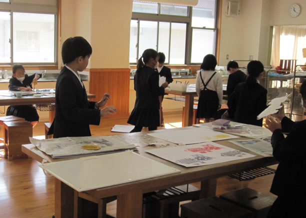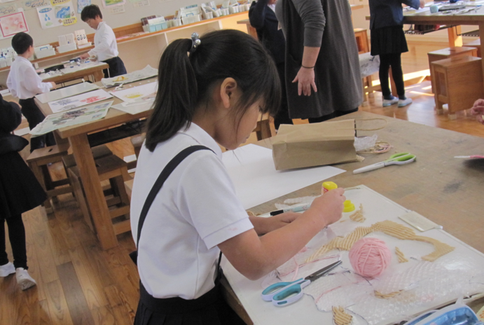図工で版画の作品を作っていた3年生。いろいろな素材を使って生き物を作成中。素材の面白さに夢中の三瓶っ子。