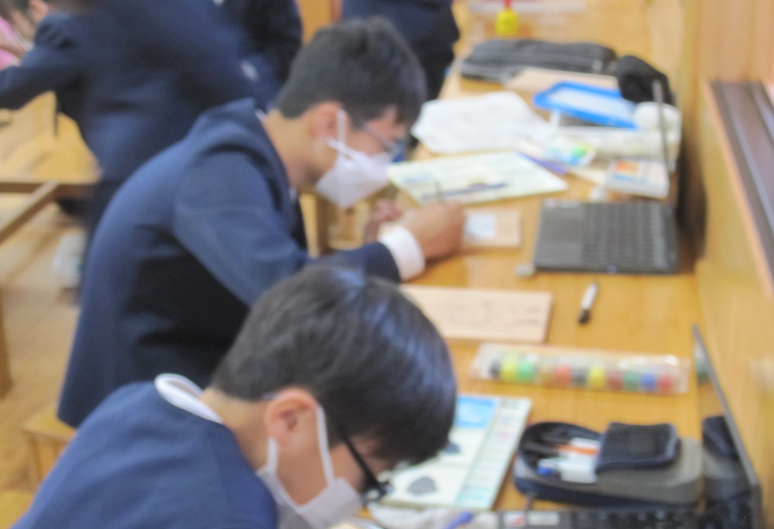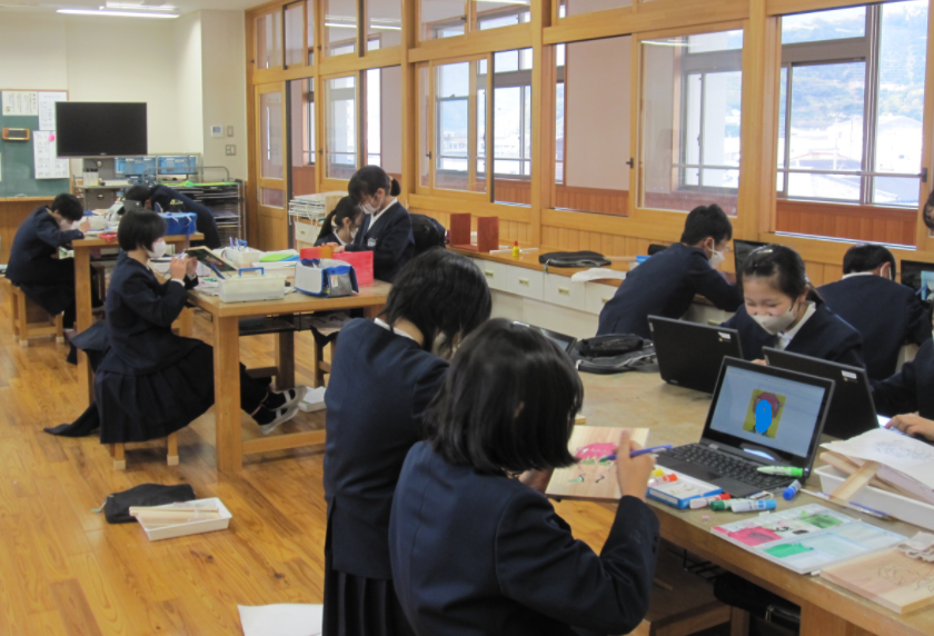 図工で作品づくりをしていた6年生。好きなイラストを板に描いています。描いた絵に色を塗っている三瓶っ子も!
