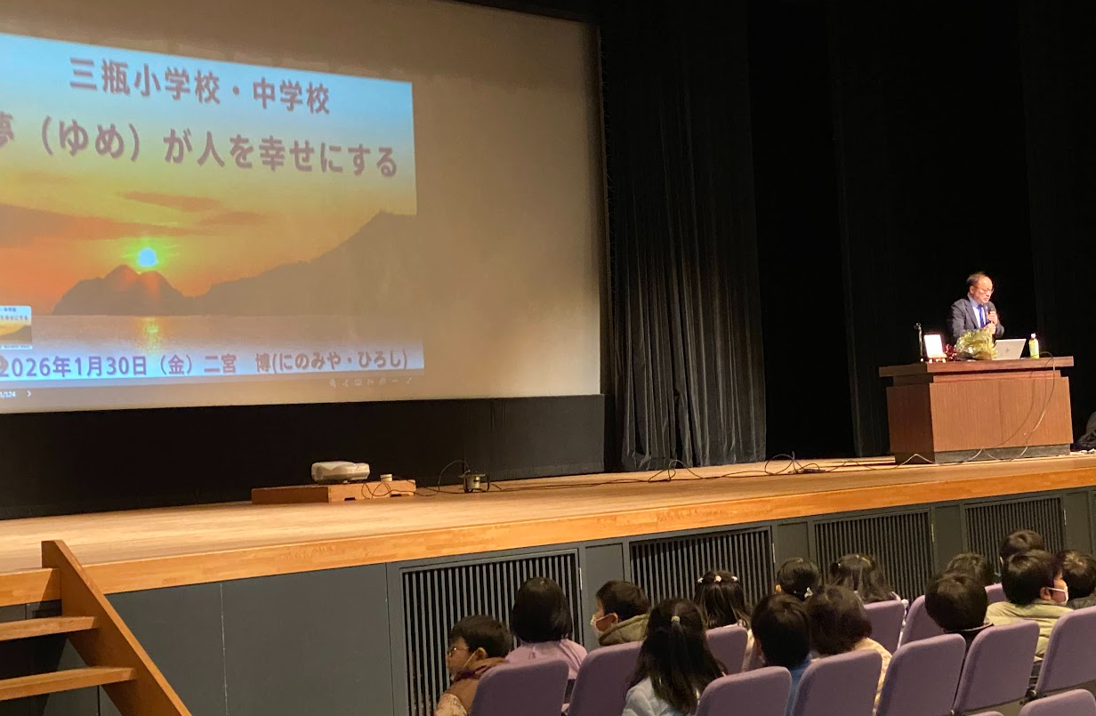 週末は、全校児童が「誰にも無限の可能性がある」のテーマでお話を聞きました。三瓶中学校との合同講演会。世界で活躍するスポーツ選手とつながりを持つ二宮博先生に御登壇いただきました。二宮先生の出身地ということで、先生の御好意から実現した講演会です。先生の話には、三瓶っ子のこれからを幸せにするキーワードがいくつも出てきました。どんな行動が夢を引き寄せるのか、運を引き寄せるのか、クイズを交えながらお話。メモをとりながら話を聞く三瓶っ子の姿も!最後は中学生の代表がお礼の言葉を述べました。